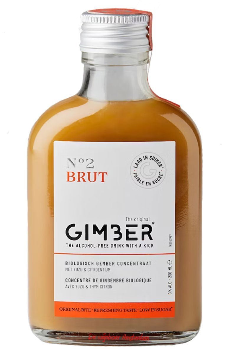 Als je even geen behoefte hebt aan alcohol, dan zijn er maar weinig echt lekkere alternatieven. Gimber is zo´n alternatief. Een concentraat van biologische Peruviaanse gember, citroenen, kruiden en specerijen. Met bruiswater geeft het de perfecte alcoholvrije drank, of met heet water maak je in een handomdraai een glas gemberthee. En het is nog uiterst gezond ook, de gingerol is goed voor de spijsvertering en cholesterolverlagend. Gimber is 100% biologisch. N°2 Brut heeft nog 50% minder suiker dan N°1 Original. Daarvoor in de plaats komt N°2 met yuzu en citroen thijm
